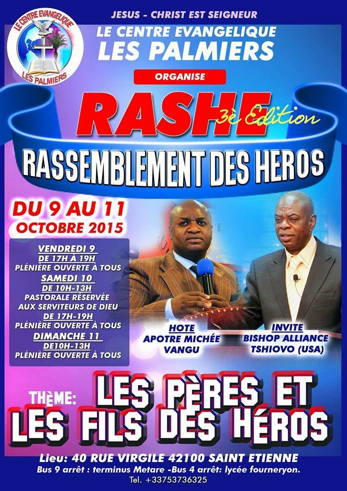 A l’occasion de son 3ème anniversaire, le Centre organise la 3ème édition de son « Rassemblement des Héros ». A ce rendez-vous, les serviteurs à l’honneur, l’apôtre Michée Vangu, hôte au service de Dieu depuis 17 ans dans l’apostolat et son invité, le Bishop Alliance Tshiovo, président de la communauté charismatique Jérusalem et pasteur responsable de l’Eglise Jérusalem à Washington DC au service du Seigneur depuis plus de 35 ans, nourriront le peuple d’un repas succulent et fortifiant. Au menu : les Pères et les Fils des héros.