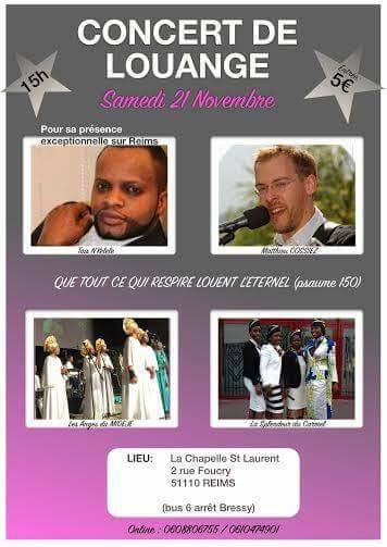 Organisé le 21 novembre 2015 dès15h, à la chapelle St Laurent, sis au 2, Rue Foucry à Reims, ce concert de louange basé sous le thème : « Que tout ce qui respire loue le Seigneur » [Psaume 50 :6] n’aura pour ultime but, outre l’offrande joyeuse au Seigneur, que le salut des âmes. Qu’au travers de ces merveilleux cantiques élevés au trône de gloire, chacun puisse véritablement reconnaître la majesté du Seigneur Jésus-Christ et son importance capitale dans nos vies garantissant, à lui seul, l’épanouissement total.